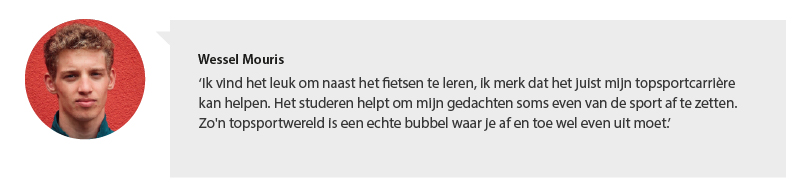 Studeren of sporten? Voor Wessel Mouris (22) is het geen vraag, maar een vanzelfsprekendheid. Sinds dit seizoen rijdt hij voor het eerst in het profpeloton bij de wielerploeg Unibet Rose Rockets, terwijl hij tegelijk de bachelor Milieu- en natuurwetenschappen aan de Open Universiteit volgt. Is het een uitdaging om die twee werelden te combineren? Wessel denkt even na: 'Je moet soms even puzzelen, maar als je het leuk vindt, werkt het.'