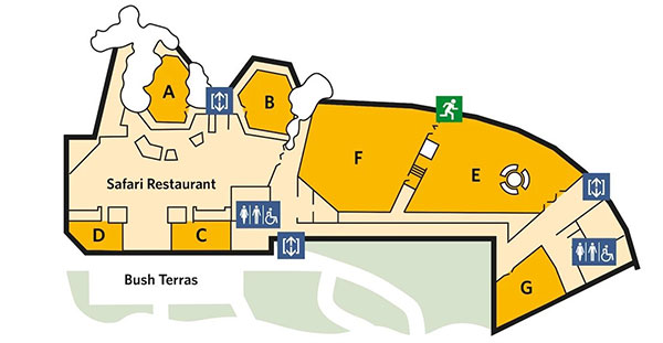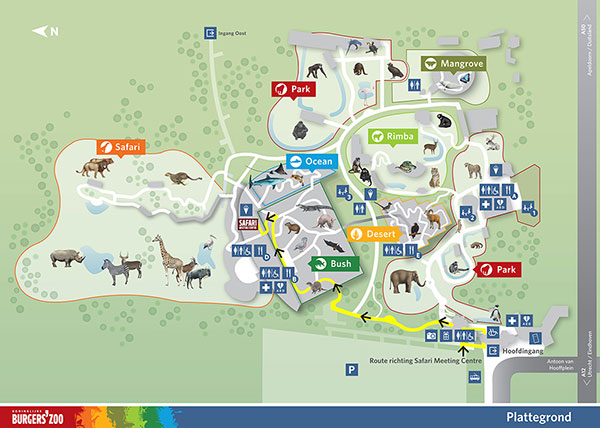 De startdag vindt plaats in de Knoefzaal van het Safari Meeting Centre. Vanaf de hoofdingang kun je de bordjes Safari Meeting Centre volgen zoals in geel aangeduid op onderstaande kaart. Deze wandeling van 5 à 10 minuten leidt je o.a. langs de pinguïns en door het tropisch regenwoud van de Bush. Neem voorbij het Bush Restaurant het pad links omhoog en loop voorbij de schuifdeuren de lange gang rechts door tot aan de Knoefzaal.