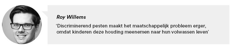 Een recent rapport van de Kinderombudsman geeft aan dat 30% van de kinderen wordt gepest op discriminatiegronden. Roy haalt het voorbeeld aan van Amina, een meisje met Marokkaanse ouders, dat op school herhaaldelijk wordt gepest. Klasgenoten zeggen dingen als 'ga terug naar je eigen land', maken grapjes over haar kledingdracht of accent, of pakken haar hijab af. 'Dit voorbeeld van Amina weerspiegelt wat we ook in de bredere samenleving zien: vooroordelen over mensen met een migratieachtergrond. Het pestgedrag versterkt deze vooroordelen, omdat andere leerlingen het zien en zo leren dat het normaal is om mensen met een andere afkomst als minderwaardig te behandelen. Zo wordt een maatschappelijk probleem - discriminatie - 'klein gemaakt' en herhaald op de schoolspeelplaats. En tegelijkertijd maakt dat discriminerende pesten het maatschappelijke probleem erger, omdat kinderen deze houding meenemen naar hun volwassen leven.’