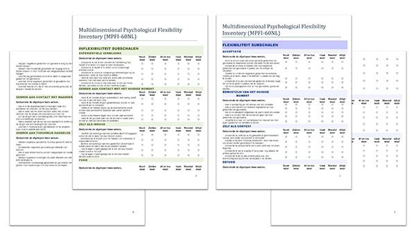 De Nederlandse vertaling en de validatie zijn uitgevoerd door I. Bodok, T. Batink, W. Kroeze, M. Nijkamp, S. Peeters, N. Jacobs & J. Reijnders van de vakgroep Levenslooppsychologie (Open Universiteit). Hun bevindingen zijn beschikbaar in preprint: 'OSF | Validation of the Dutch Multidimensional Psychological Flexibility Inventory (MPFI-60 and MPFI-24) and its predictive value'.