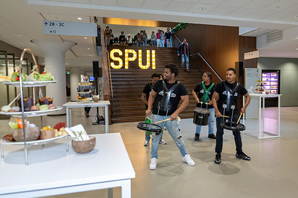 De opening was een feestelijke middag vol ontmoeting tussen genodigden, dans, muziek en mooie inhoudelijke bijdragen. Studenten, onderzoekers, gasten en bestuurders lieten zien hoe we (gaan) samenwerken aan maatschappelijke vraagstukken in Den Haag én ver daarbuiten. Caspar van den Berg van UNL ziet de campus als symbool voor de beweging die de universiteiten van Nederland hebben ingezet. 'Weg van afzonderlijke instellingen die elkaar beconcurreren. Veel meer naar partners die samenwerken en oplossingen vinden voor maatschappelijke problemen.' Onze hoogleraar Reijer Passchier van de Rechtenfaculteit maakte indruk met een vlammend betoog over de noodzaak van kennisdeling met beleidsmakers over hoe overheidsbeslissingen over technologie van invloed zijn op onze rechtsstaat en democratie.